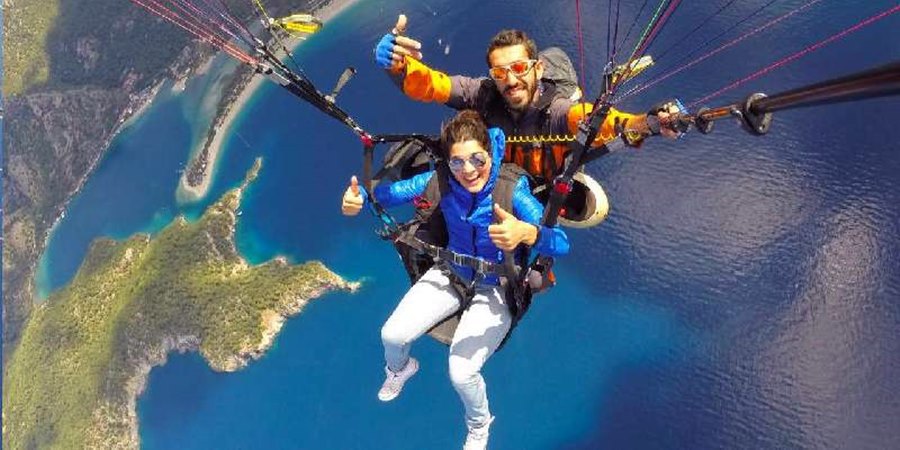 Landen Sie sanft auf dem Cleopatra-Strand – feiern Sie mit High-Fives! Sehen und kaufen Sie Ihre Flugmedien (~€10-20). Entspannen Sie sich kurz in Strandcafés, bevor der Bus zurückfährt. Kein Mittagessen inbegriffen, aber nahegelegene Restaurants bieten türkische Köstlichkeiten.