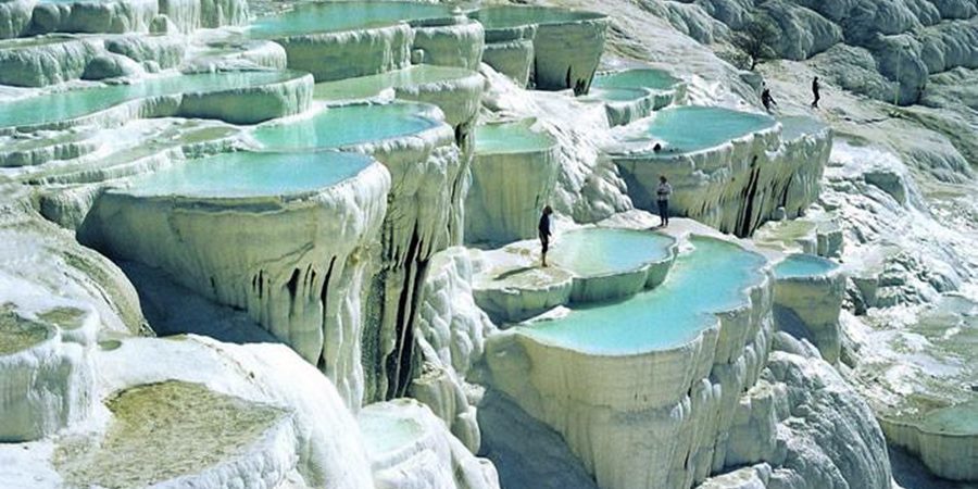 Atemberaubende Landschaften: Spazieren Sie entlang der ikonischen weißen Travertinterrassen von Pamukkale, die durch mineralreiche Thermalwasser gebildet wurden. 🏖️